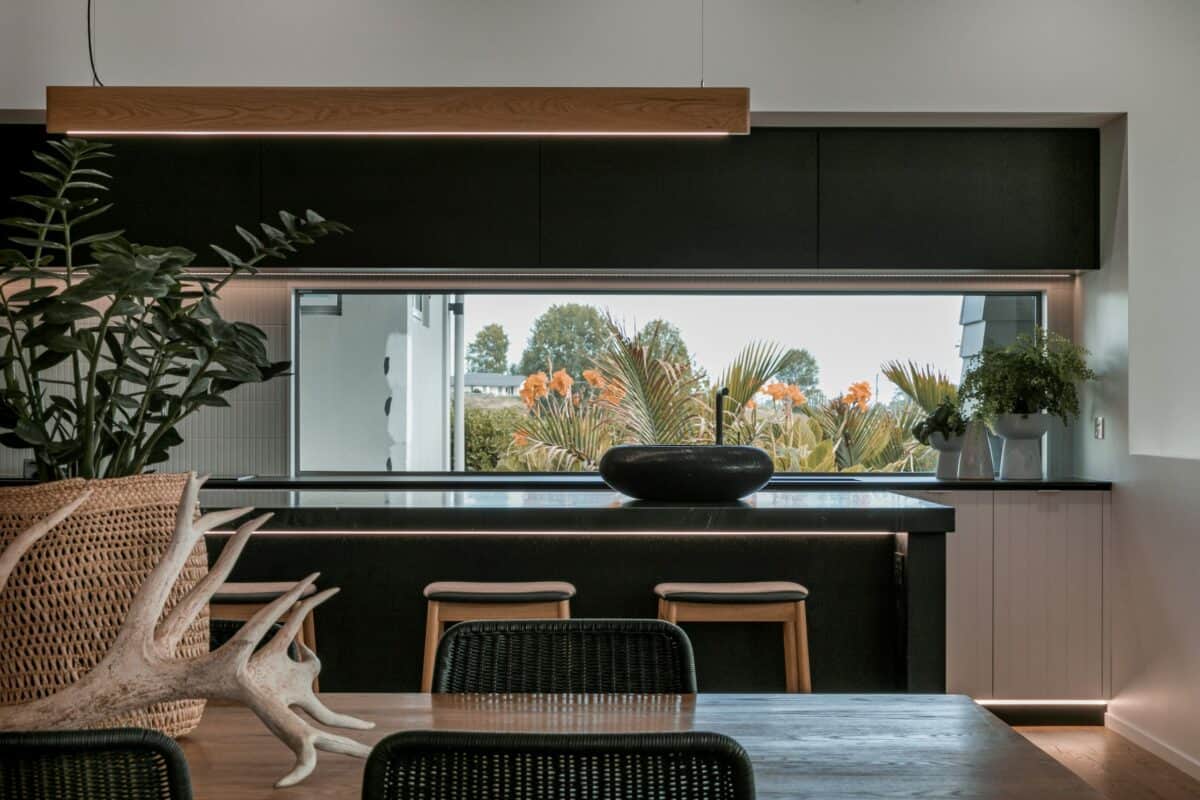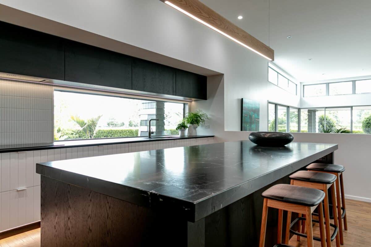 The choice of subtle strip LED lighting under the overhead cabinetry and under the island bench adds a level of sophistication and creates an atmosphere. For the working area of the kitchen our client has chosen white on the under-bench cabinetry, this is an excellent way to keep the space feeling open.
